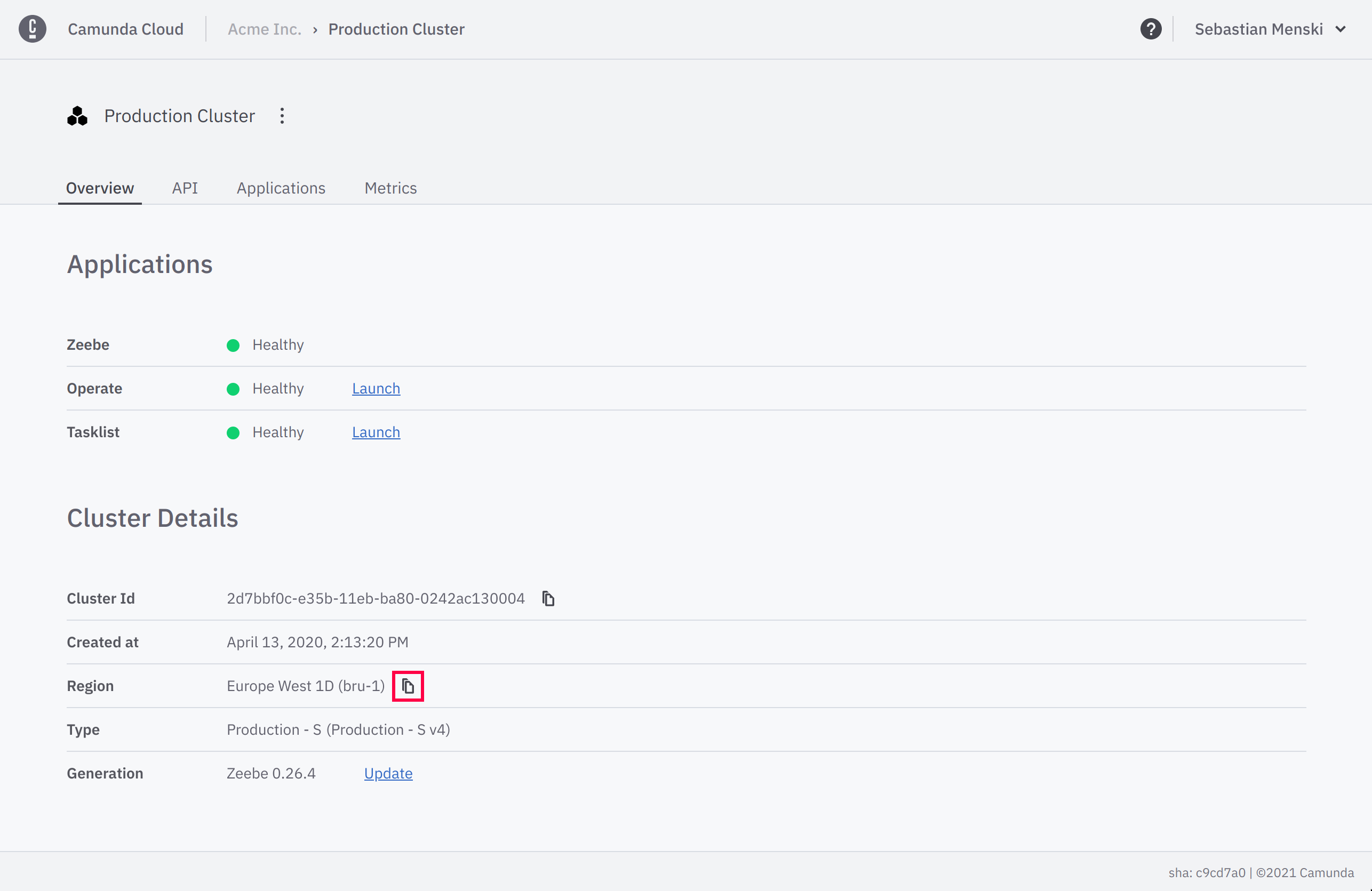 To copy the region of your cluster, visit the clusters details page in Camunda Cloud Console, and select the copy button next to the region.